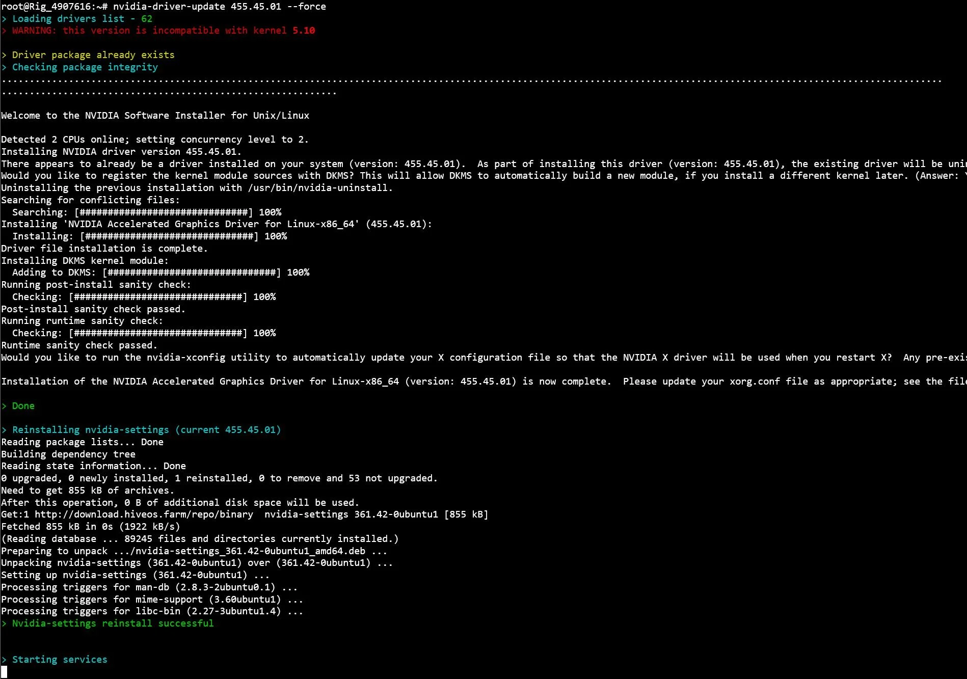 You may see a warning, but it can be ignored. Wait for the install to complete entirely, and then reboot your rig.